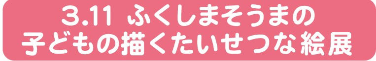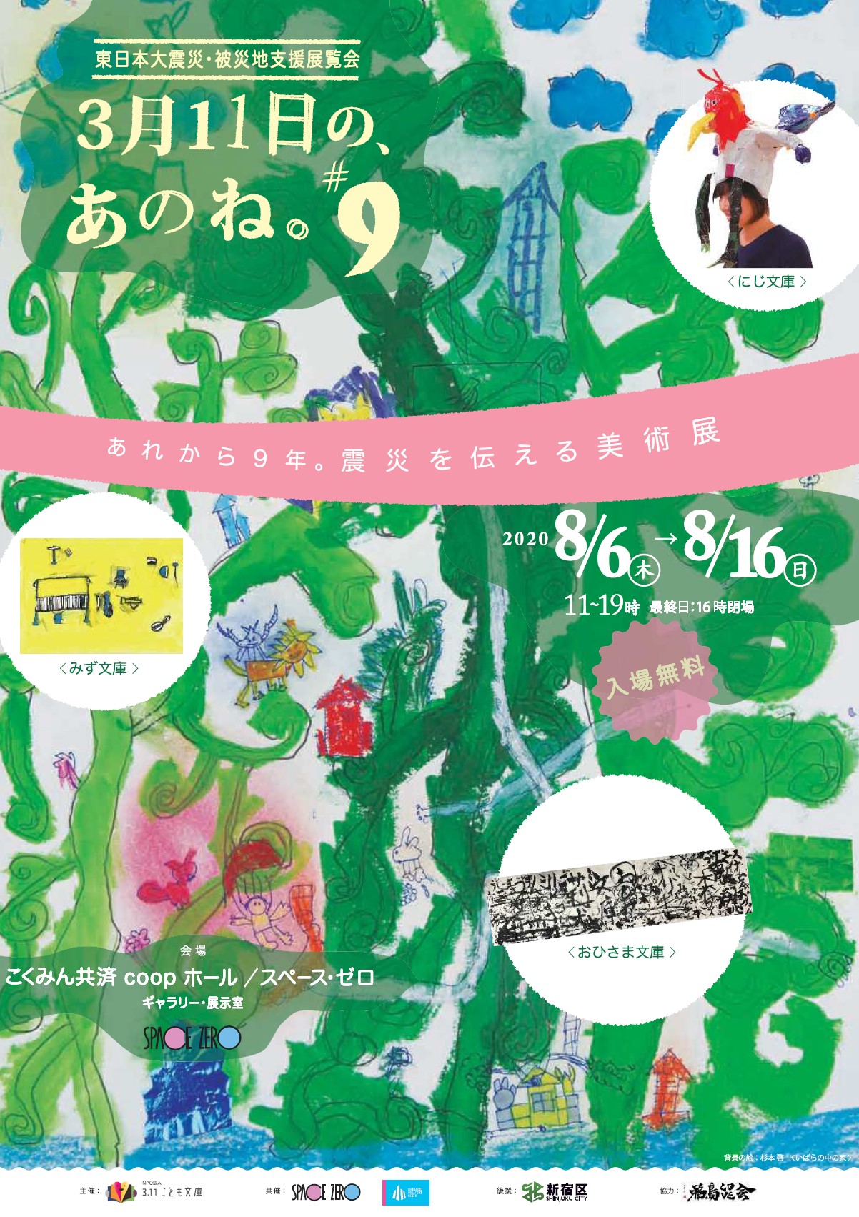 | 主催/共催/後援/協力 | 〈主 催〉 NPO法人3.11こども文庫〈共 催〉 スペース・ゼロ、新宿クリエイターズ・フェスタ実行委員会〈後 援〉 新宿区、徳間書店、株式会社Too、アスラン書房、ティー・エフ・シー東京フロリネット株式会社多摩生花地方卸売市場、相馬市立中村第二小学校の避難所児童と三年生/2011年当時(担任教師、佐藤みゆき、安積崇、西山弥生、浜須直文)、相馬市立磯部小学校の避難児童〈協力アーティスト〉 ニシハラ☆ノリオ(かぶりものアーティスト)、蟹江 杏(版画家)〈協 力〉 福島LOVE会、Jiyucolor自由色、自由の森学園、絵本や画材を寄付していただいた全国・世界の皆様、 ボランティアで活動に参加していただいた方々 〈宣伝美術〉 |